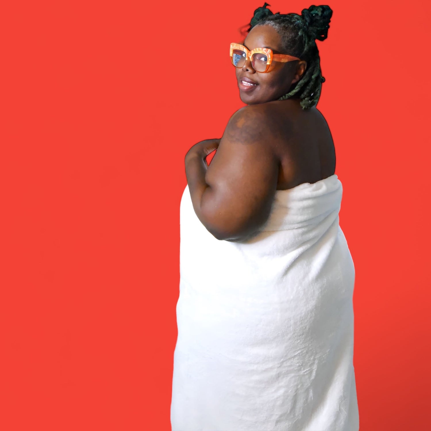 "Fluffy joy with a big enough towel. It's not just big it's huge. I'm not going to lie, I cried a bit the first time I used it."